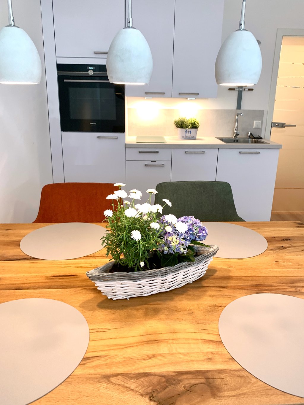 Das Herzstück unserer Ferienwohnung ist das geschmackvoll eingerichtete Wohnzimmer, mit einer hochwertigen offenen Küche, ein großer Esstisch und stylische, sehr bequeme Sessel. Für Ihre Unterhaltung sorgt ein großer 65 Zoll LED-TV. Einem geselligen Spieleabend steht mit der kleinen Spielesammlung nichts mehr im Wege. Für die passende Musik sorgt ein Bluetooth-Lautsprecher zum Abspielen der eigenen Musik vom Smartphone oder Tablet.