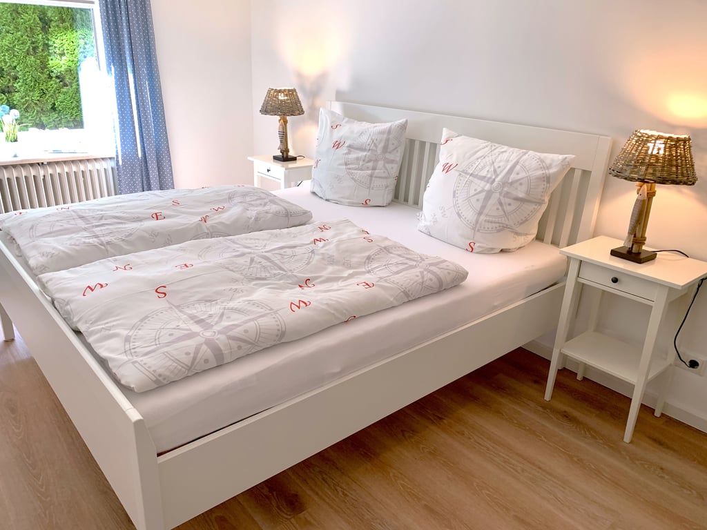 Die Zwei liebevoll eingerichteten Schlafzimmer sind voll ausgestattet, mit jeweils einem Doppelbett (180 x 200 cm), einem komfortablen Pax-Kleiderschrank und einem Relax-Sessel. Jedes der Schlafzimmer hat einen modernen Waschtisch mit Spiegel.