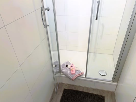 Die neu geflieste Dusche ist klein aber fein. Das WC mit Waschbecken befindet sich in einem separaten Raum, sodass keine Wartezeiten aufkommen.