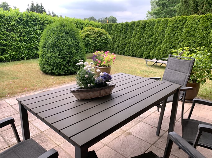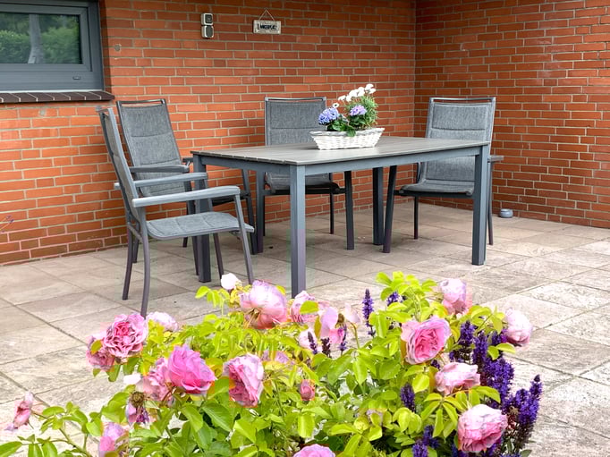 Ein weiteres Highlight ist die schöne große, überdachte Terrasse, die mit Gartenmöbeln und Sonnenschirm zu lauschigen Stunden einlädt.